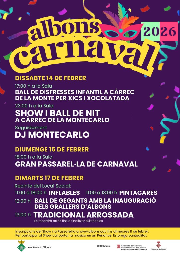 A continuació us presentem el programa d’activitats pel Carnaval d’Albons 2026.